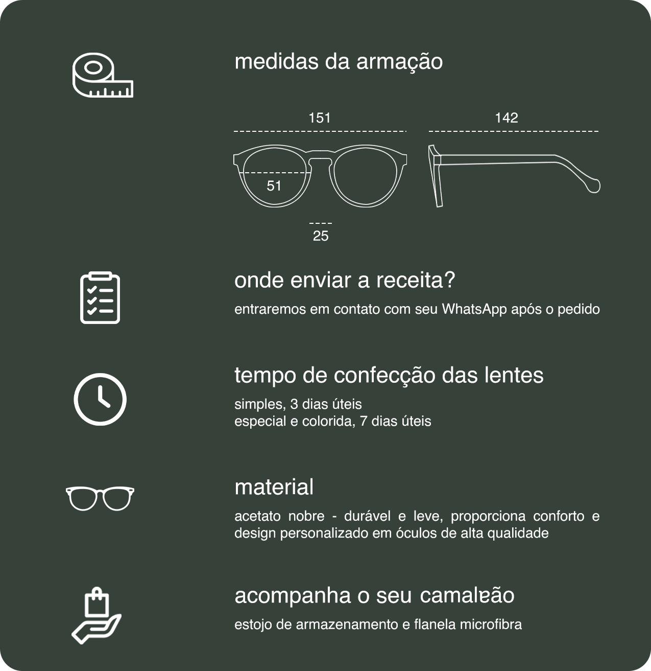 Material Acetato Premium: Feitos com acetato de alta qualidade, os óculos Sam são leves e confortáveis, garantindo um encaixe super agradável no rosto.